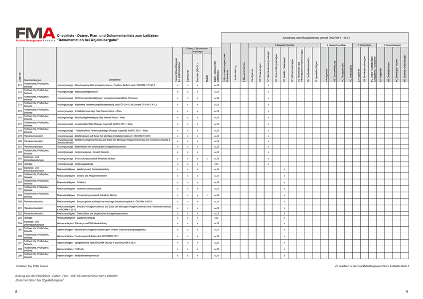 Die Erstellung der Checkliste erfolgte durch Sichtung bestehender Unterlagen und Zusammenführung diverser Checklisten von FM-Dienstleistern sowie den Vorgaben aus der ÖNORM A 7010-5 Objektbewirtschaftung – Datenstrukturen – Teil 5: Objektbuch zur nutzungs- und betriebsorientierten Informationsweitergabe.